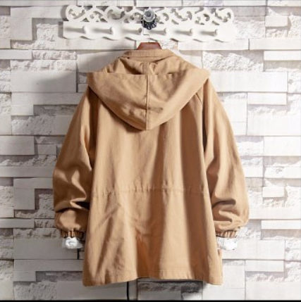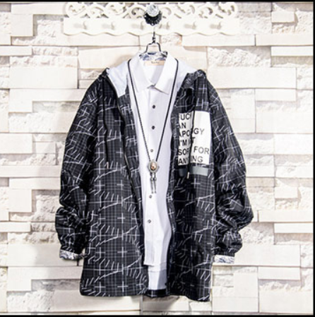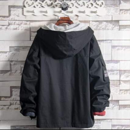 Spring and autumn windbreaker men's mid-length patch printing ins tide brand men's jacket casual men's Korean hooded jacket men black L